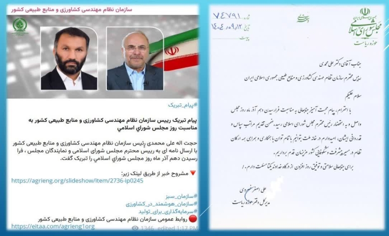 توفیق شما در عرصه خدمت به اعضا و بهره برداران بخش کشاورزی از خداوند متعال خواستاریم.